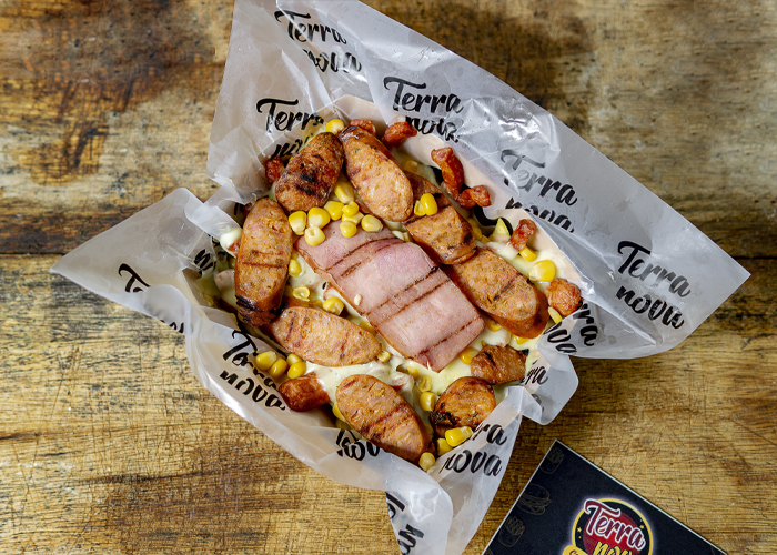 Papas, chorizo ternera, salchicha, tocineta, queso fundido, maízcitos y salsa de la casa.