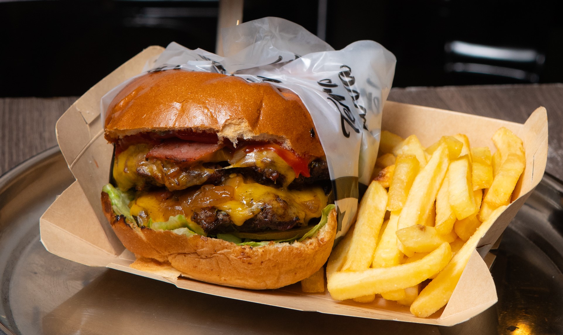 Pan artesanal, carne de la casa, tocineta, queso americano, cebolla caramelizada, lechuga y tomate.