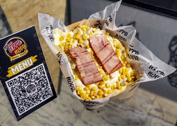 Papas, llanera, tocino ahumado, queso fundido y maízcitos.