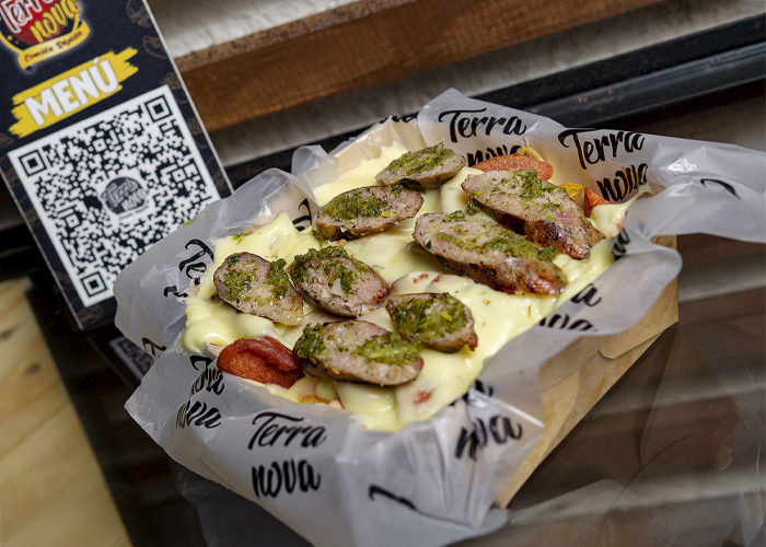 Papas, salchicha, queso fundido y chorizo argentino con chimichurri.