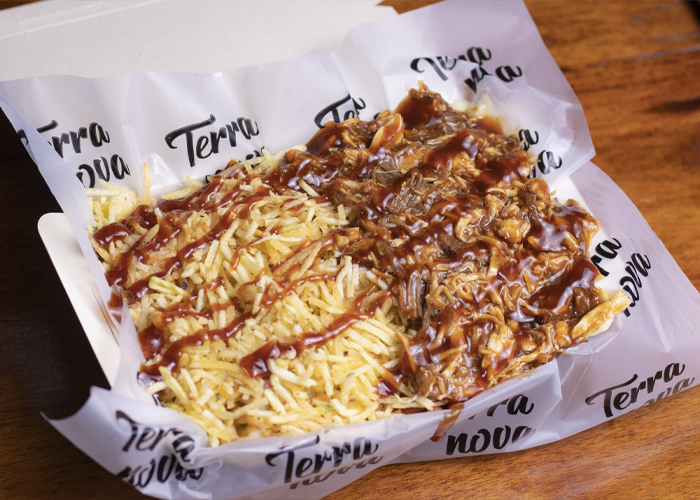 Papas, salchicha, queso fundido, fosforito, pollo y carne en salsa BBQ.