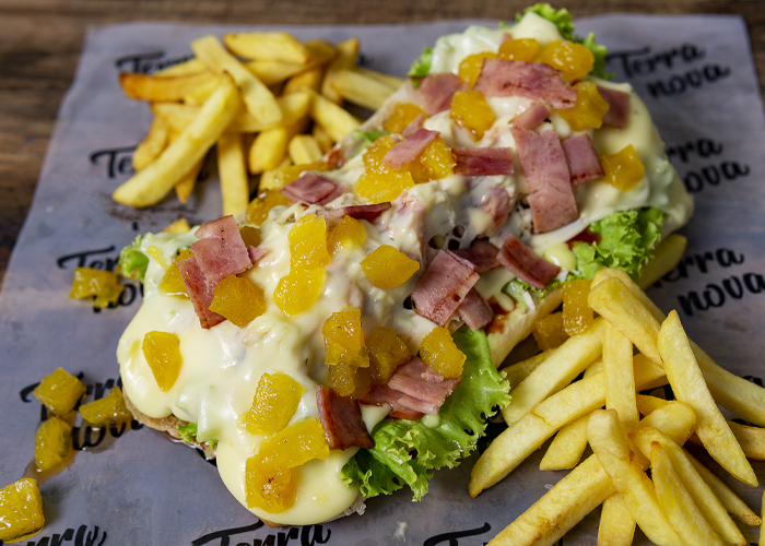 Pan artesanal, chorizo de ternera, tocineta, pollo desmechado, trocitos de piña, queso blanco, cebolla caramelizada, lechuga y tomate.
