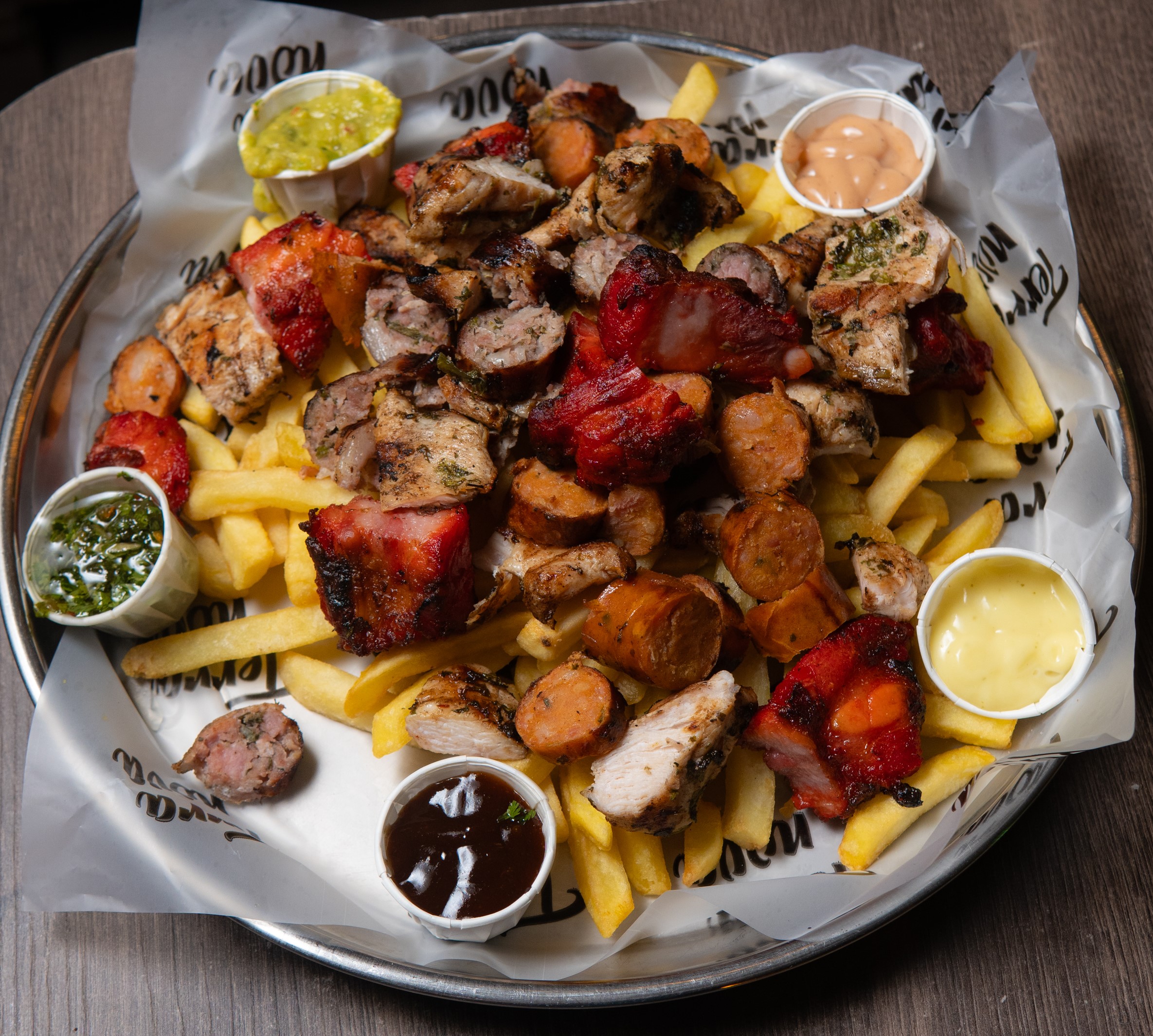 Papas, pechuga, costilla y chorizos (ternera y argentino), con salsa BBQ y guacamole. No incluye queso.