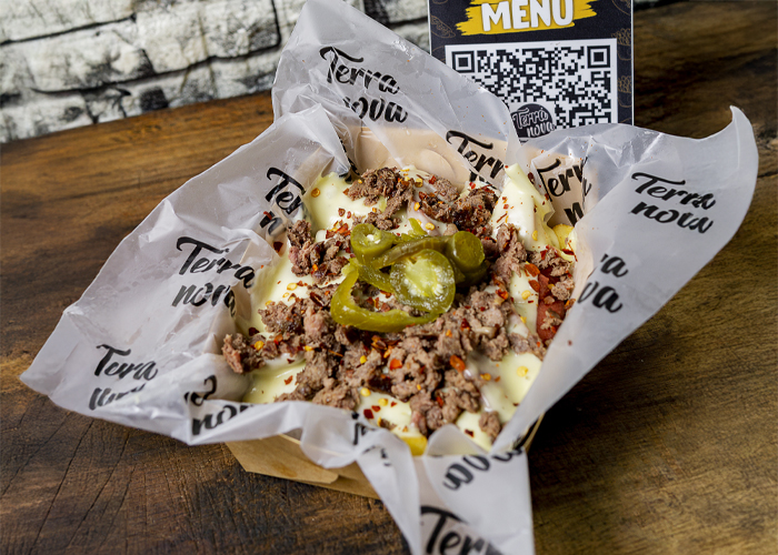 Papas, salchicha, queso fundido, salsas de la casa, carne molida, paprika y jalapeños.