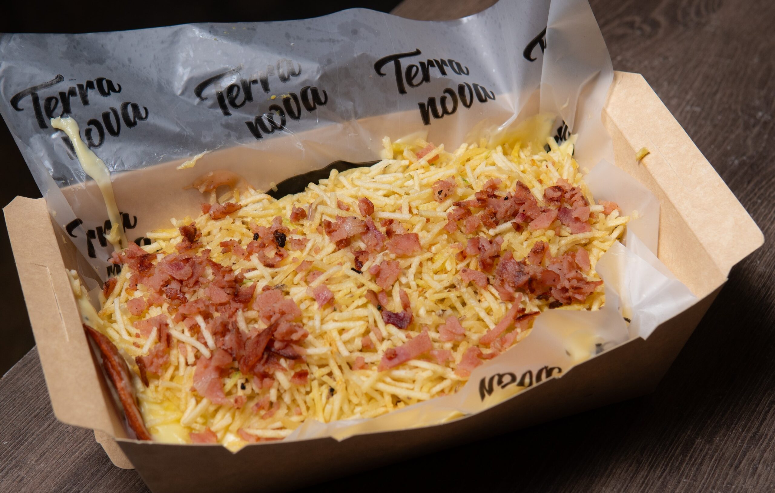 Papas, llanera, tocino ahumado, queso fundido y maízcitos.