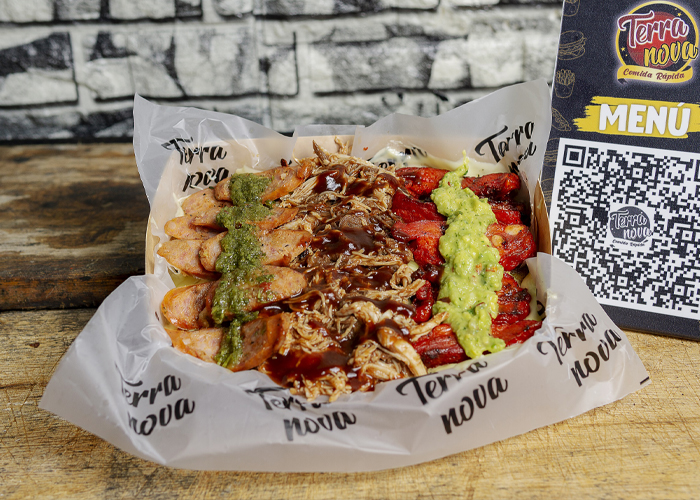 Papas, salchicha, queso fundido, pollo y carne a la BBQ, chorizo con chimichurri y costilla con guacamole.